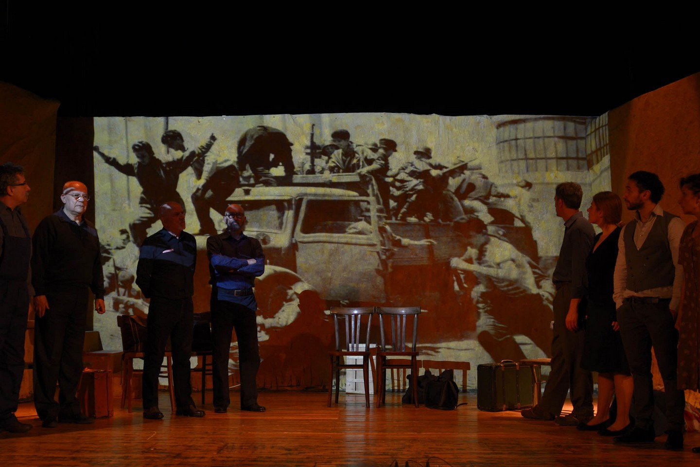 Commedia comico-drammatica in due atti di Erri De Luca con Salvatore La Malfa, Pietro Agostinetto, Pina Vivolo, Daniela Amoroso, Marco Tramontano, Annalisa Massarelli, Luca Criscuolo, Ciro Caliendo, Pino Oriolo scene Gianni Calabrese, regia Mario Mirelli Napoli, seconda guerra mondiale. In un rifugio antiaereo durante i bombardamenti, nove personaggi intrecciano le proprie esistenze. Le loro diverse voci ci raccontano la capacità di reagire alla spietata bruttura della guerra. La napoletanità è il filo conduttore di quell’ironia sardonica, quella capacità unica nel suo genere, di prendersi gioco di sé e degli altri anche in situazioni altamente drammatiche. E’ il ritratto di una città violentata, che però non si rassegna maturando il proprio spirito di riscatto che, infine, sfocia nelle famose Quattro Giornate che cacceranno i Tedeschi da Napoli. Si sorride in modo spontaneo della comicità che traspare dai dialoghi, ma, anche, ci si commuove profondamente. | ||||||||||